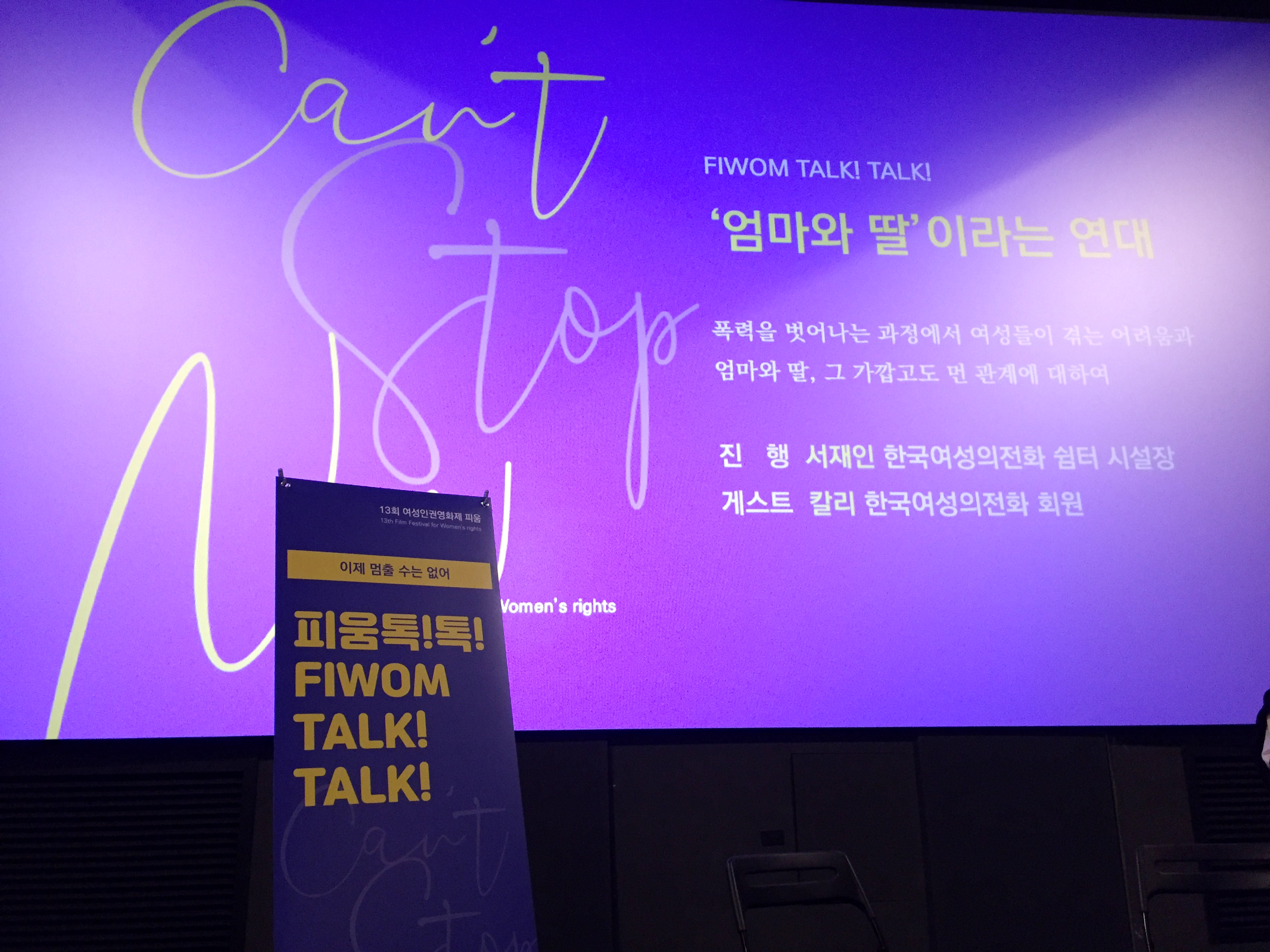 ‘가족’이라는 이름으로 묶여있음에도 엄마와 딸의 관계는 한 마디로 정리할 수 없다는 점에서 네 영화는 우리에게 생각할 거리를 준다. 이에 대해 영화 상영 이후 ‘<'엄마와 딸'이라는 연대> - 폭력을 벗어나는 과정에서 여성들이 겪는 어려움과 엄마와 딸, 그 가깝고도 먼 관계에 대하여’라는 주제로 피움톡톡이 진행되었다. 한국여성의전화 쉼터 서재인 시설장이 진행을 맡고, 한국여성의전화 회원 칼리가 패널로 참여했다.