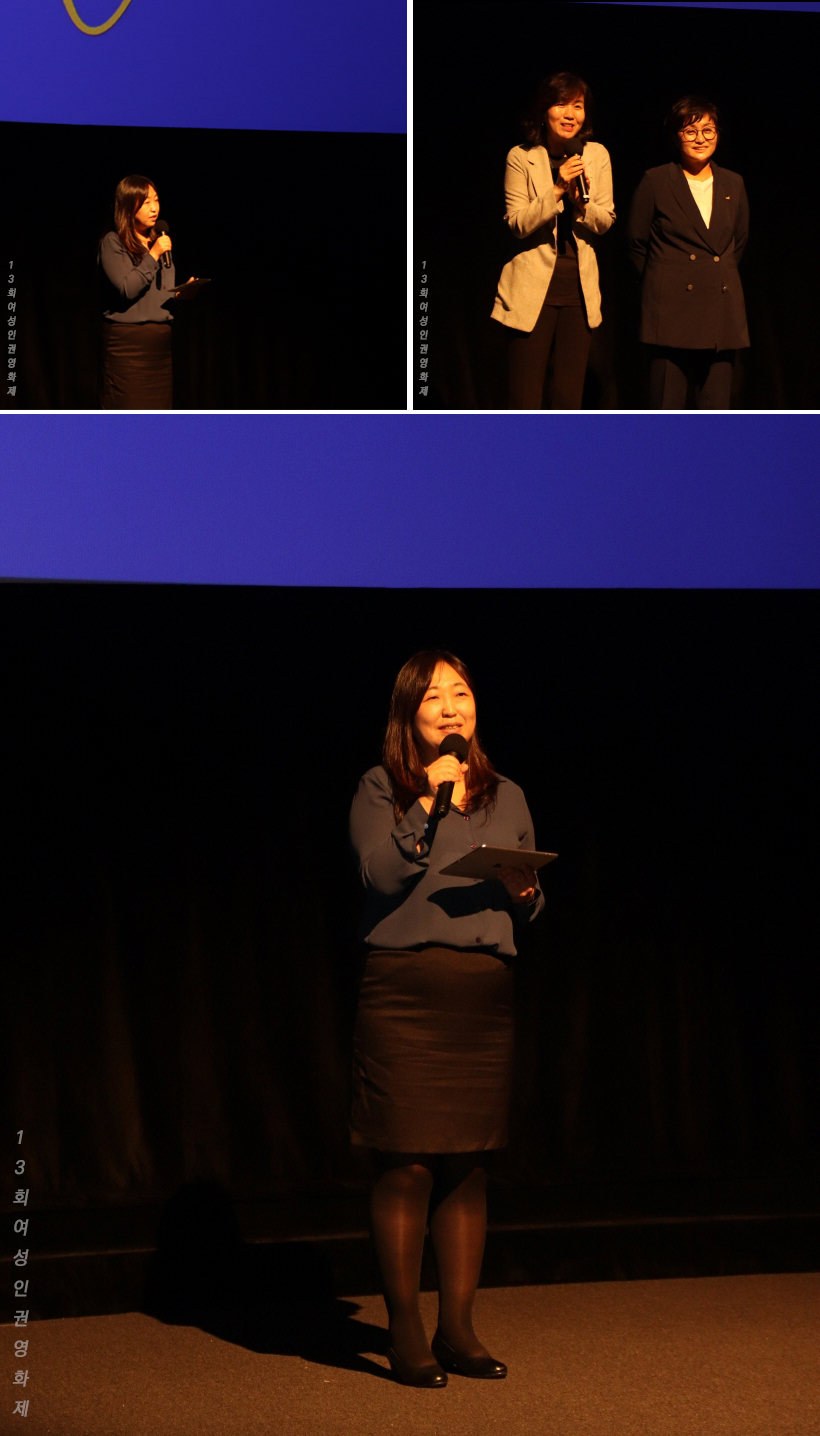여성인권영화제 수석 프로그래머 란희 님의 진행으로 영화제의 막을 올리는 개막식이 진행되었습니다. 언제나 든든한 공동 집행위원장인 미주, 근양 님의 개막선언으로 행사가 시작되었는데요. 개막식에 참석한 다양한 관객들 덕분에 CGV 본관이 들썩였다는 후문입니다. 많은 분들이 참석해주신 가운데 몇 분을 사진으로 소개해 볼까 합니다. (찡긋) (미소)